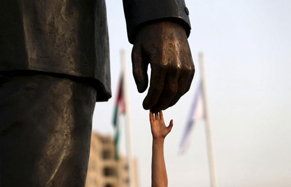 A Palestinian man touches the Mandela statue during the inauguration of Nelson Mandela Square in the West Bank city of Ramallah. Tuesday, April 26, 2016. REUTERS/Mohamad Torokman