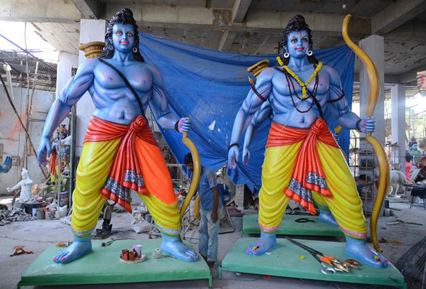 An artist puts the final touches to statues of the Hindu God Lord Ram ahead of the Sri Rama Navami Festival in Hyderabad, India. Wednesday, April 13, 2016. Photograph: Noah Seelam/AFP/Getty Images
