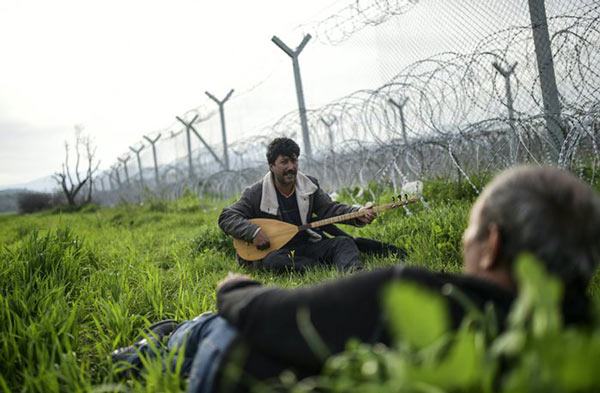 A refugee from northern Syria plays an instrument at a makeshift camp near the border fence in Idomeni, Greece. Sunday April 3, 2016. Photograph: Bulent Kilic/AFP/Getty Images
