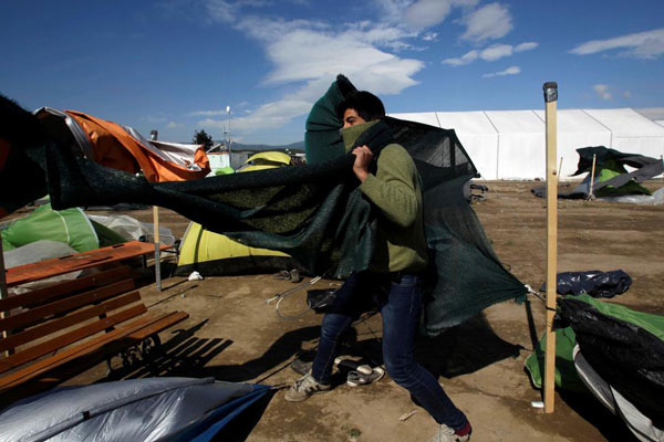A refugee tries to withhold his tent from strong winds at a makeshift camp at the Greek-Macedonian border near the village of Idomeni, Greece. Tuesday, April 26, 2016. REUTERS/Alexandros Avramidis