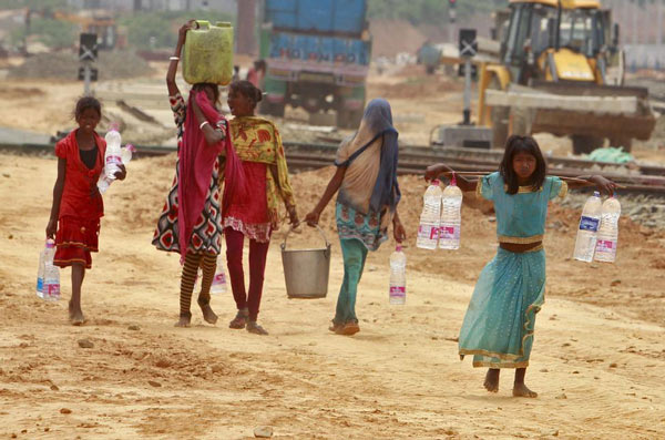 Young girls carry containers filled with drinking water beside the railway station in Agartala, India. Wednesday, April 20, 2016. REUTERS/Jayanta Dey