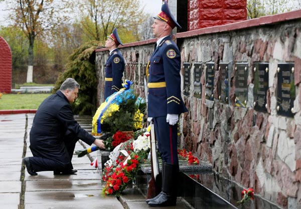 Ukrainian President Petro Poroshenko lays flowers during a commemoration ceremony at a monument to “liquidators”, emergency workers who fought the blaze at the Chernobyl nuclear reactor, near the Chernobyl nuclear power plant, Ukraine, April 26, 2016. REUTERS/Valentyn Ogirenko