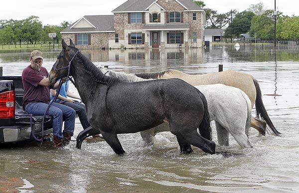 Richard Lopez and Allie Hairford-Siemens hold the reins of three horses as they lead them through flood water in Cypress, Texas, on Monday April 18, 2016. Melissa Phillip/Houston Chronicle/AP